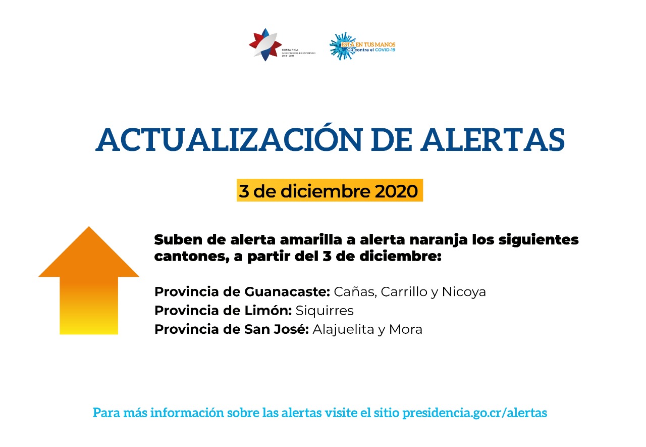 Pueden visitar el sitio http://presidencia.go.cr/alertas para conocer las alertas, medidas y restricciones implementadas en su cantón.