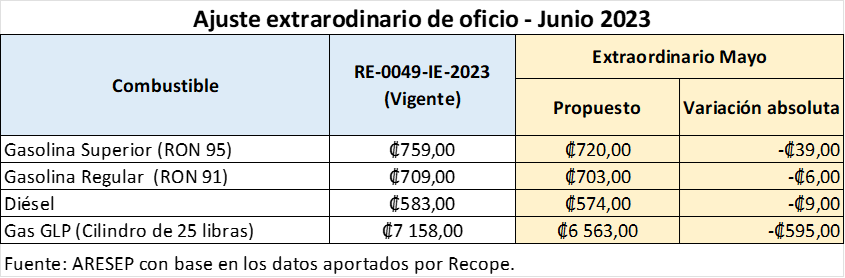 Después de completar el análisis técnico de la información aportada por Recope, según la metodología vigente, se plantea una disminución de ¢39 en la gasolina superior, ¢6 en la gasolina regular, ¢9 en el diésel y ¢595 en el cilindro de gas de 25 libras (el de mayor consumo en el país).