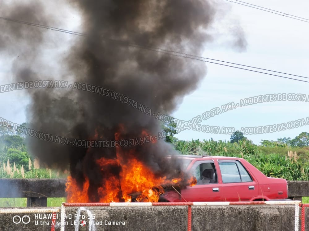 Hace pocos minutos un vehiculo que circulaba en La Ruta 32, sobre el puente del Rio Chirripo en Matina, alzo en llamas.