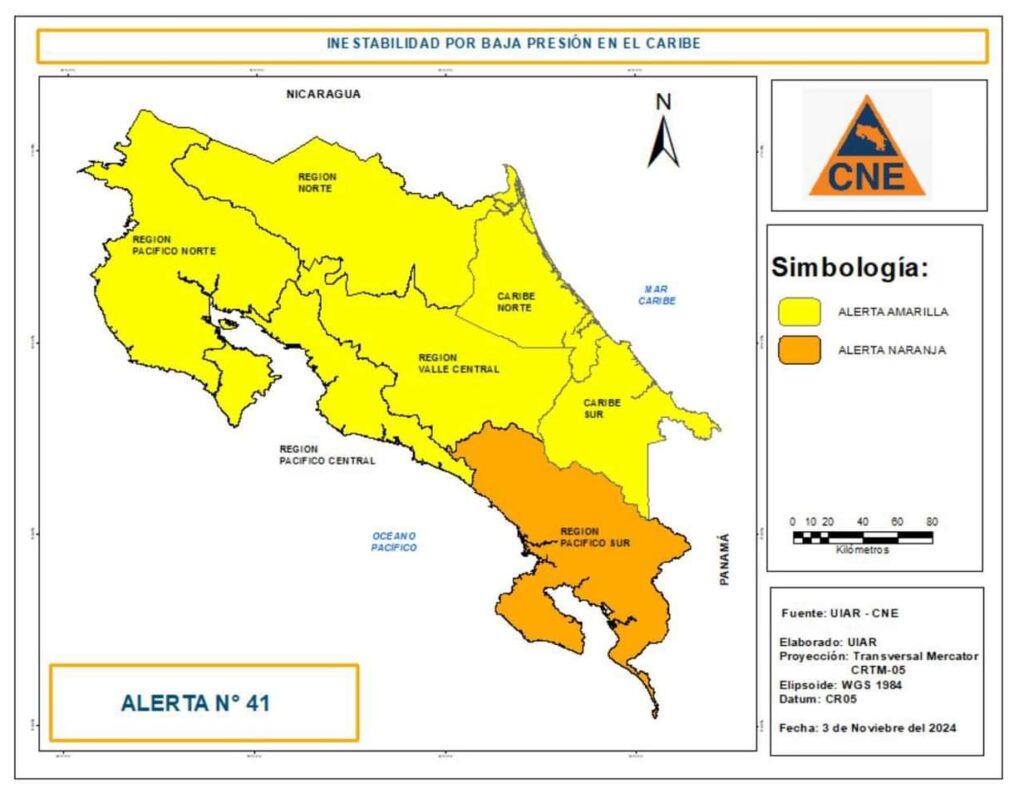𝙋𝙤𝙧 𝘼𝙘𝙘𝙞𝙙𝙚𝙣𝙩𝙚𝙨𝙙𝙚𝙘𝙤𝙨𝙩𝙖𝙧𝙞𝙘𝙖.𝙣𝙚𝙩. La Comisión Nacional de Emergencias (CNE) anunció un aumento en el nivel de alerta en varios cantones del Pacífico Sur y el Caribe Sur, ante el pronóstico de lluvias intensas y la saturación de suelos. Los cantones de Pérez Zeledón, Golfito, Corredores, Osa, Puerto Jiménez, Buenos Aires y Coto Brus pasaron de alerta amarilla a naranja, mientras que el Caribe Sur subió de alerta verde a amarilla.
