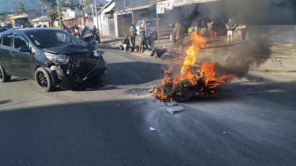 Se trato de la colision entre un vehiculo liviano y una motocicleta, y posteriormente la moto despues del impacto, alzo en llamas.