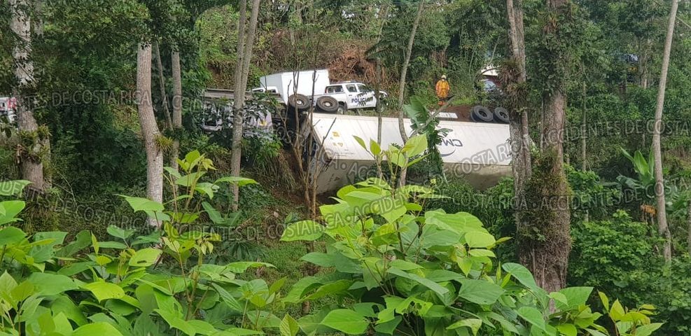 Bomberos atienden en estos momentos el vuelco de un vehiculo pesado en el sector del Recreo de Turrialba.