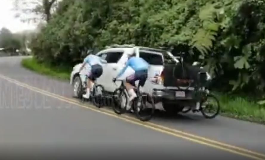 ??? ?????????????????????.???. Durante la Sexta etapa celebrada el dia de ayer entre La Union y Perez Zeledon, se dio un hecho bastante inusual , cuando varios ciclistas se aprovecharon y fueron remolcados por un pick up.