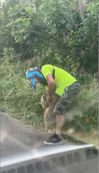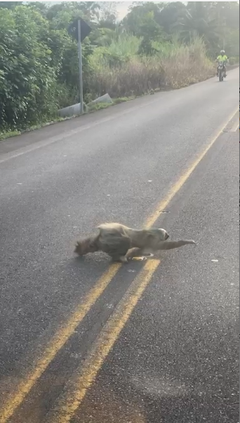 De acuerdo con las imágenes, el hombre se detuvo y se acercó al animal con la intención de ayudarlo; sin embargo, al momento de levantarlo, el perezoso reaccionó de forma agresiva, aferrándose con sus garras y generando un inesperado forcejeo.