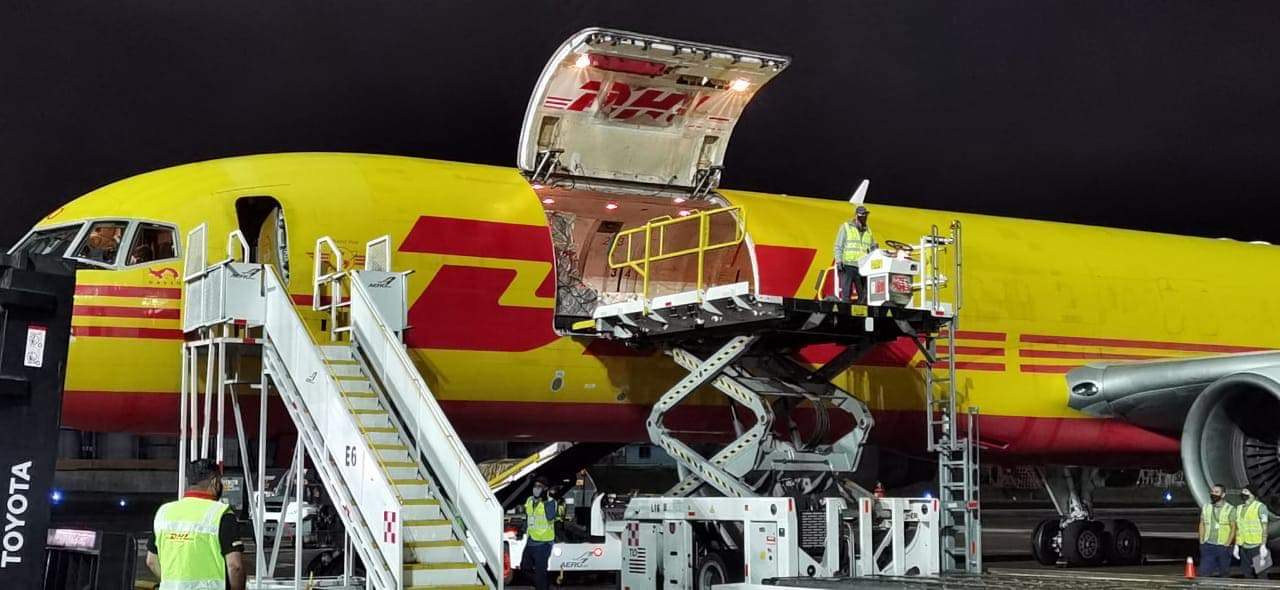 Este miércoles a las 9:04 de la noche aterrizo en el aeropuerto Juan Santamaría el vuelo de DHL procedente de Bélgica con escala en Miami, con la segunda entrega de 11 700 dosis de la vacuna contra la covid-19.