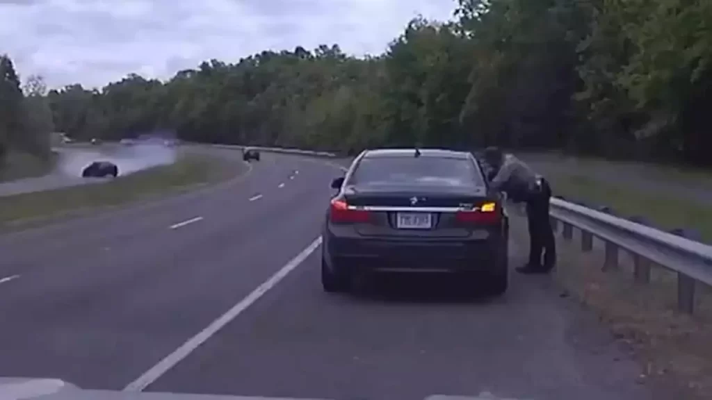En el video se puede ver como un carro está estacionado en el lado derecho de la carretera y un agente habla con el conductor. Se ve también cómo un vehículo negro, pierde el control, se salta la mediana, y se estrella contra el otro carro que estaba parado. El policía pudo ver a tiempo al vehículo y salir corriendo. Una colisión que pudo haber terminado en tragedia.