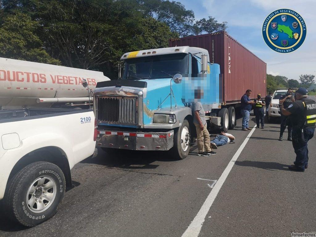 La Fuerza Pública recibió una alerta, por parte de aparentes víctimas, que notaron un contenedor que iba adherido a un cabezal que no pertenece a la empresa, por lo que oficiales de Turrucares les dan seguimiento y son capturados.