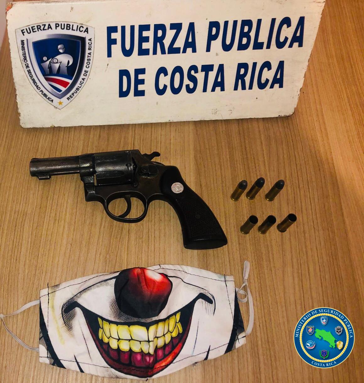 De inmediato la víctima alerta a la policía, quienes dan seguimiento y ubican a los dos sospechosos con un arma de fuego calibre .38, seis proyectiles y una máscara con la figura de “payaso diabólico”.