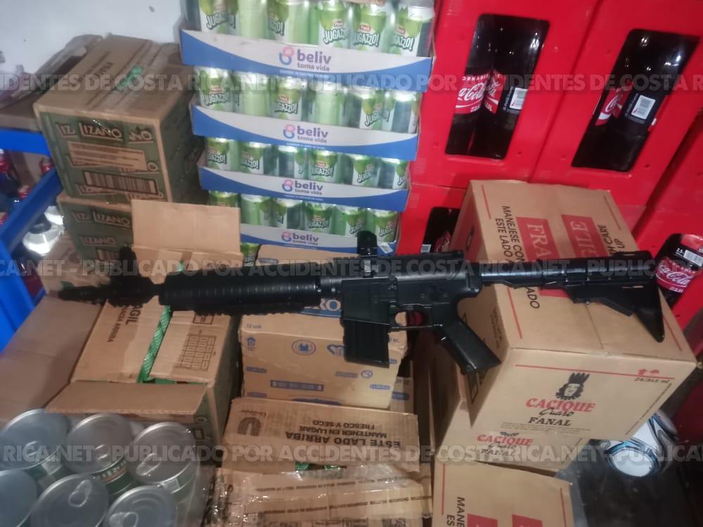Las autoridades policiales indicaron que, en el sitio se observaron dos armas, una de ellas es una carabina aparentemente de plástico, maletines y dinero en el piso del local.