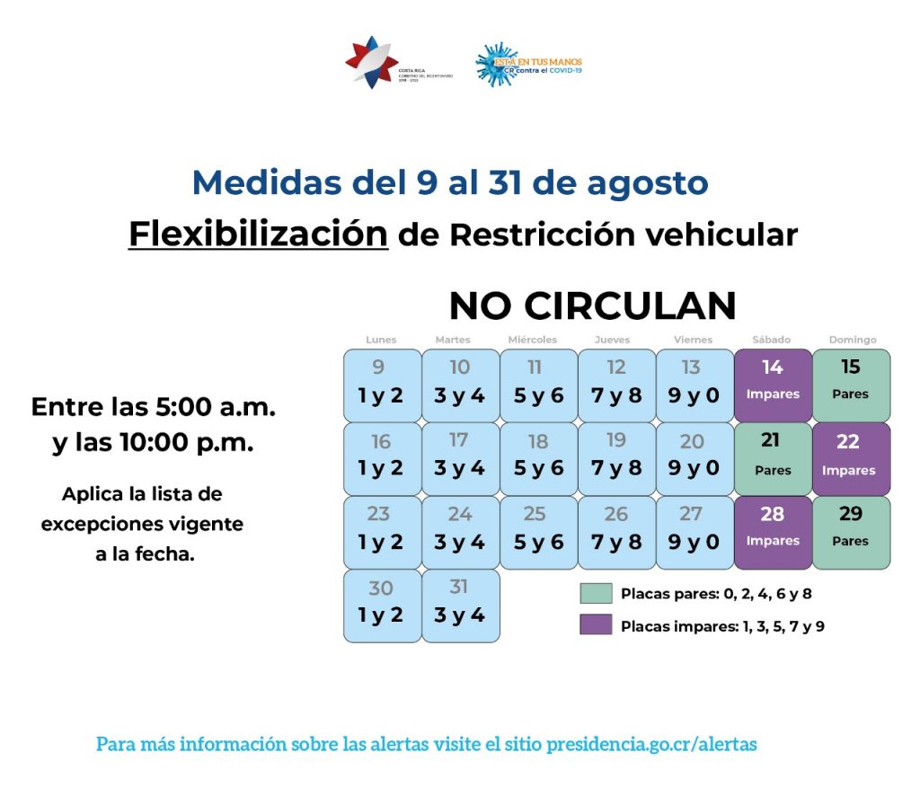 • A partir del 9 de agosto la restricción vehicular sanitaria se flexibiliza y será de 5:00 am a 10:00 pm en todo el país; los vehículos circularán cuatro días de cinco durante la semana.