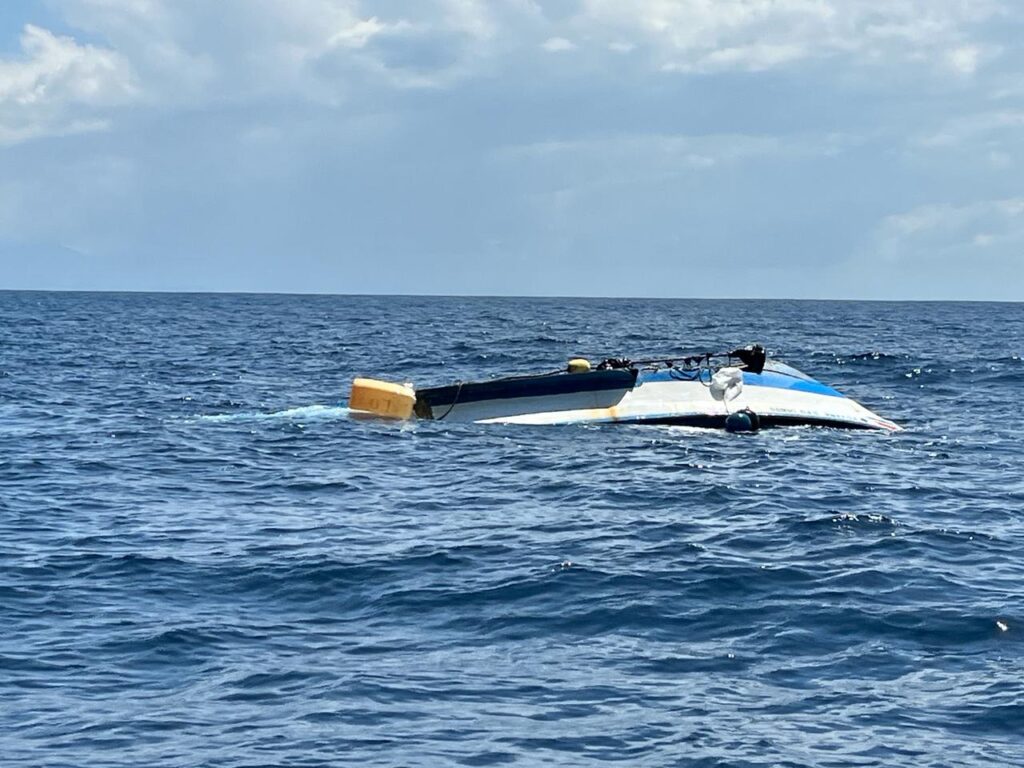 Afortunadamente, los oficiales del Guardacostas llegaron hasta el punto donde las corrientes habían arrastrado a los náufragos, cuya embarcación estaba volcada y ellos reposaban sobre su casco, en el que apenas cabían los cuatro náufragos.