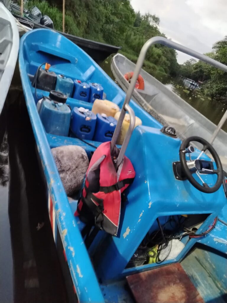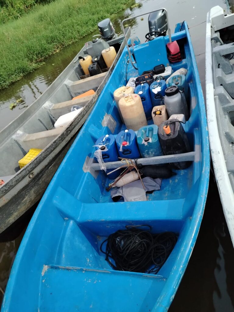 Ante la situación, los oficiales le dieron persecución hasta lograr detenerla; dentro de la misma, se ubicaron 9 estañones con combustible, que rondan aproximadamente los 580 litros, cantidad que no es permitida llevar para el tipo de embarcación intervenida.