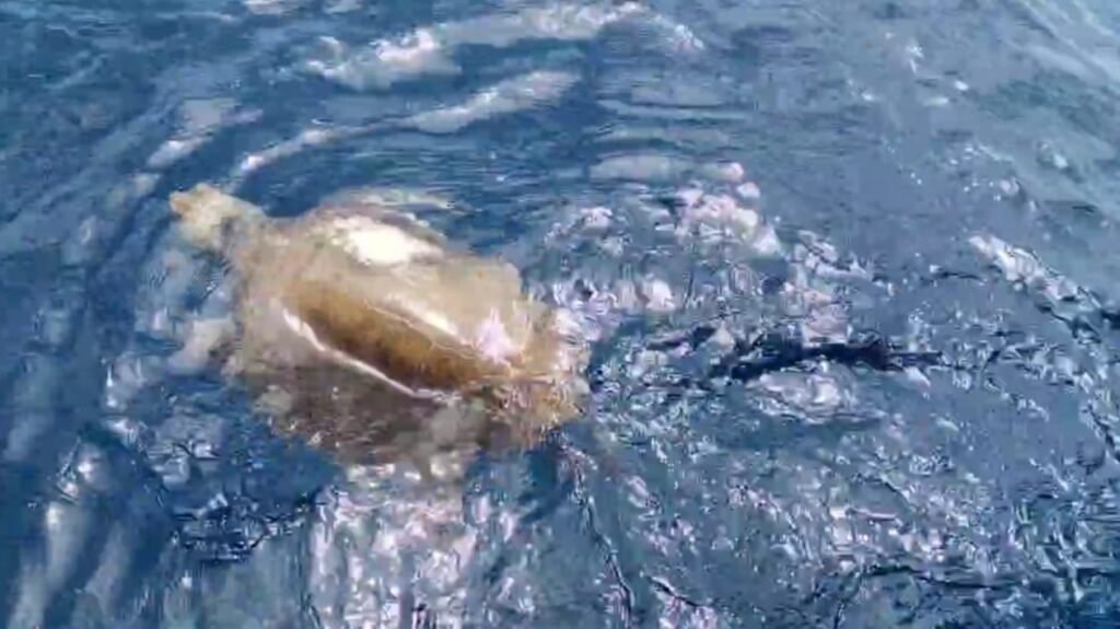 Su aleta superior derecha estaba completamente atada a la cuerda del dispositivo electrónico, por lo que el reptil realizaba, en vano, grandes esfuerzos para poder desatarse.