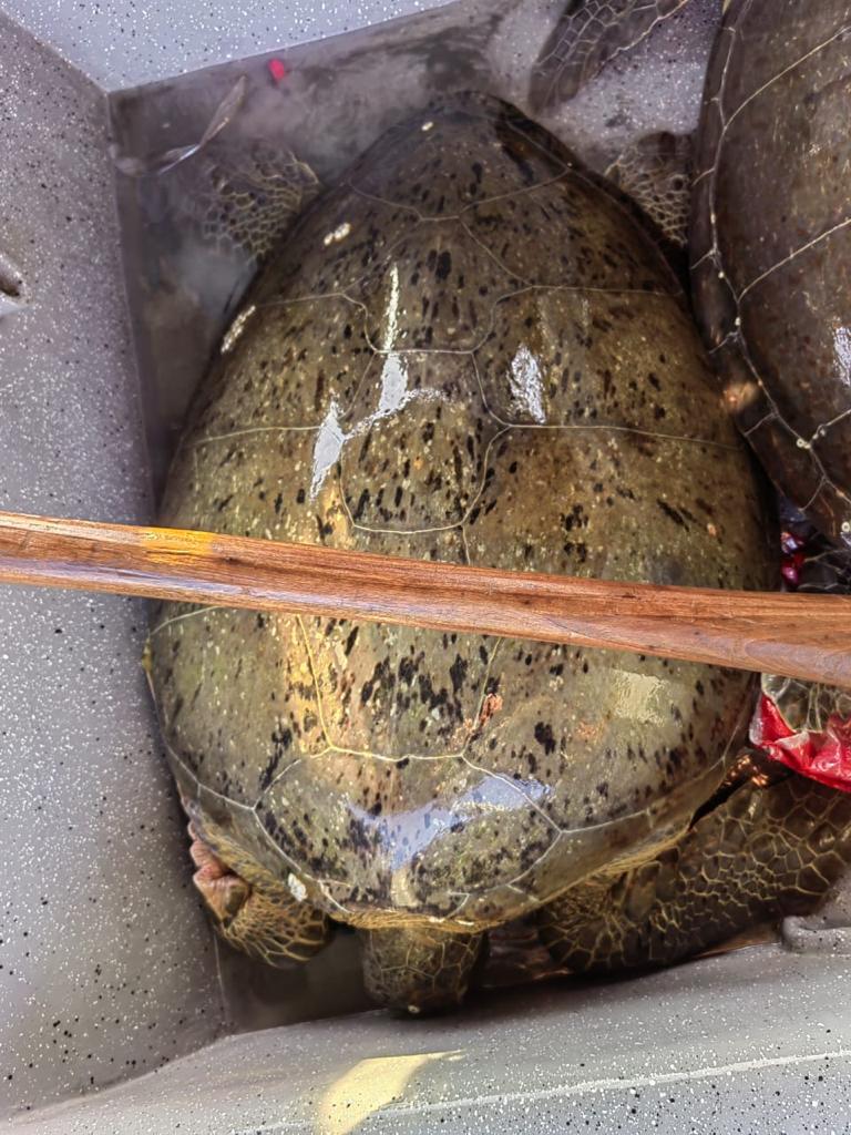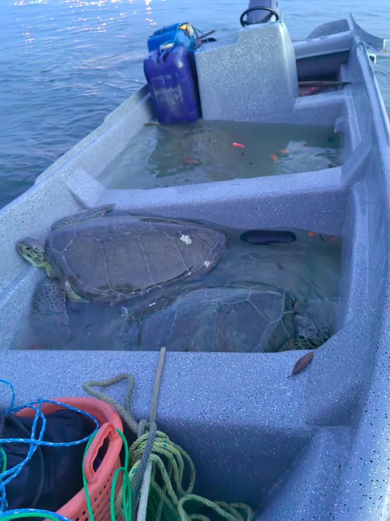 Oficiales Grupo de Operaciones Especiales (GOPES) del Servicio Nacional de Guardacostas, destacados en el Caribe, rescataron tres tortugas verdes y detuvieron a tres sujetos que las transportaban.