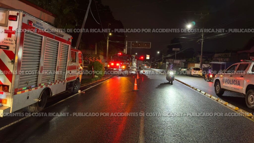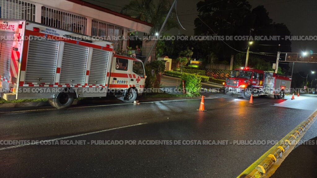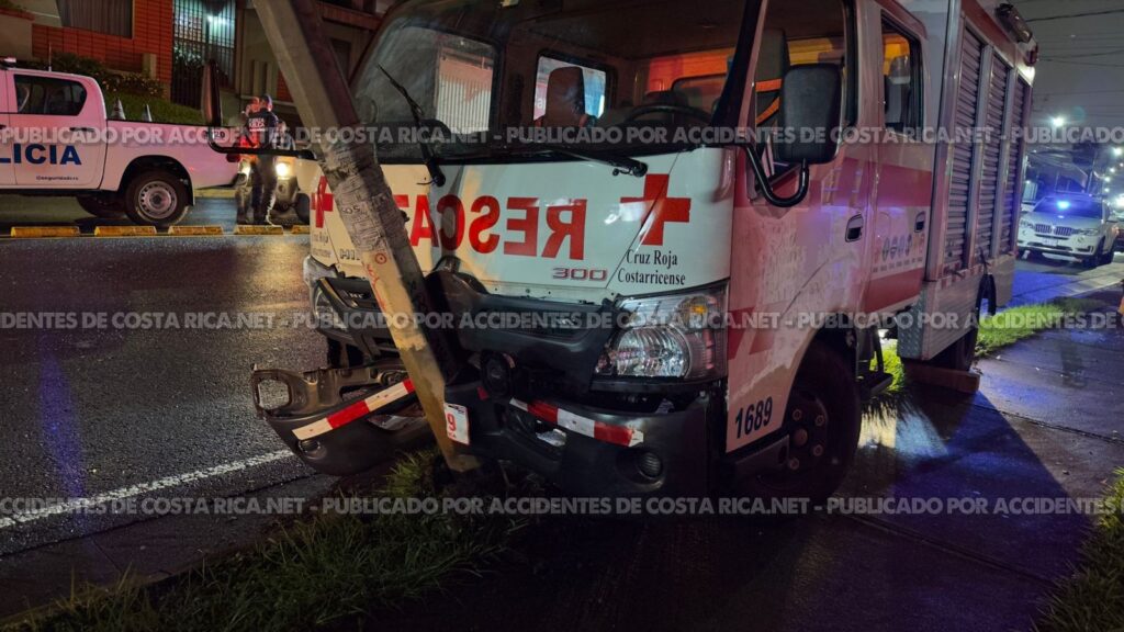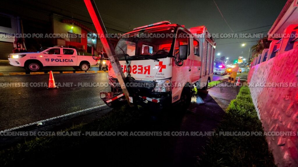 𝙋𝙤𝙧 𝘼𝙘𝙘𝙞𝙙𝙚𝙣𝙩𝙚𝙨𝙙𝙚𝙘𝙤𝙨𝙩𝙖𝙧𝙞𝙘𝙖.𝙣𝙚𝙩. Una unidad de rescate de la Cruz Roja Costarricense (CRC) colisionó contra un poste cuando se dirigía a socorrer a los ocupantes de un camión que había chocado contra un poste eléctrico la noche de este martes en San Joaquín de Flores, Heredia.