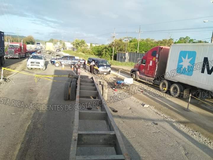 Por razones que se investigan , el motociclista choco contra la carreta del vehiculo pesado, y al llegar el personal de Cruz Roja, lo declara fallecido en el sitio.