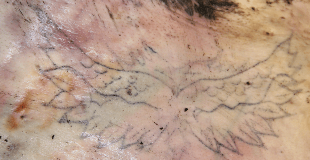Aparentemente se podría tratar de un masculino que tiene un tatuaje de unas alas en la espalda. Además, portaba una pulsera de color roja.