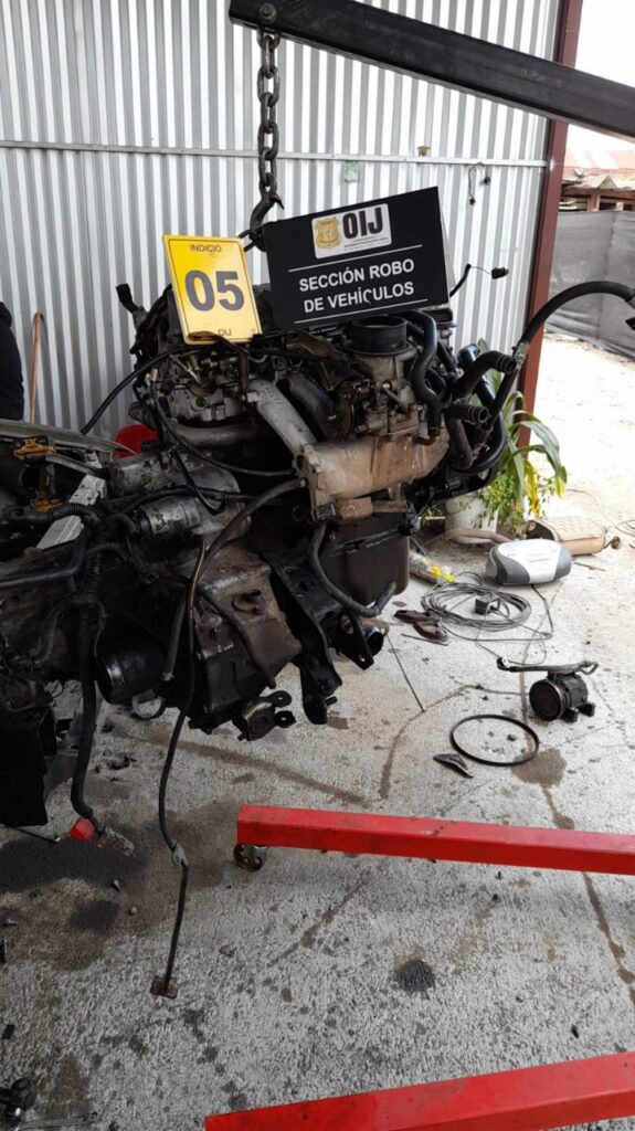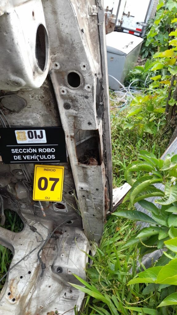 Además de los vehículos, se confiscaron una motocicleta reportada como robada en Santa Bárbara de Heredia, un automóvil negro por alteración de señas y marcas, así como diversos componentes vehiculares vinculados a casos de robo. Entre estos, se encontraba un chasis con denuncia de sustracción en febrero pasado en San José, así como motores y piezas de carrocería también bajo investigación.