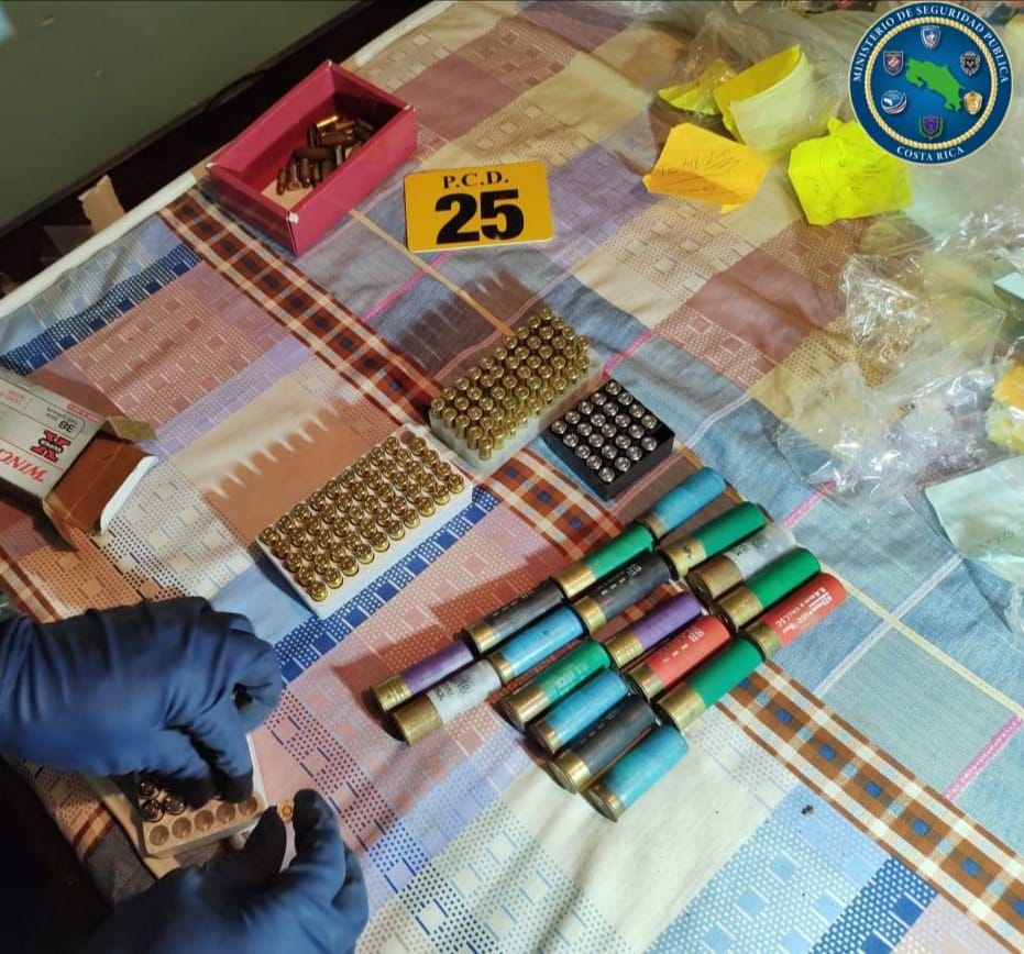 Ahí, la PCD realizó un contundente allanamiento donde decomisaron 8.336.125,00 colones, 883 dólares, un arma de fuego tipo escopeta, 254 municiones, ocho matas de marihuana, ocho dosis de marihuana, seis dosis de cocaína. Además, en el sitio la PCD capturó a los tres sospechosos de nacionalidad costarricense, quienes fueron identificados como de apellidos Segura, Sanabria y Guzmán.