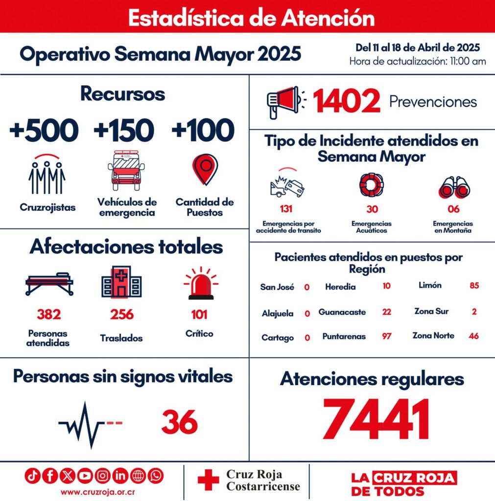 𝙋𝙤𝙧 𝘼𝙘𝙘𝙞𝙙𝙚𝙣𝙩𝙚𝙨𝙙𝙚𝙘𝙤𝙨𝙩𝙖𝙧𝙞𝙘𝙖.𝙣𝙚𝙩. La Cruz Roja Costarricense brindó atención a 382 personas durante el Operativo de Semana Santa 2025, desplegado entre el 11 y el 18 de abril, según el informe oficial actualizado a las 11:00 a.m. de este jueves.