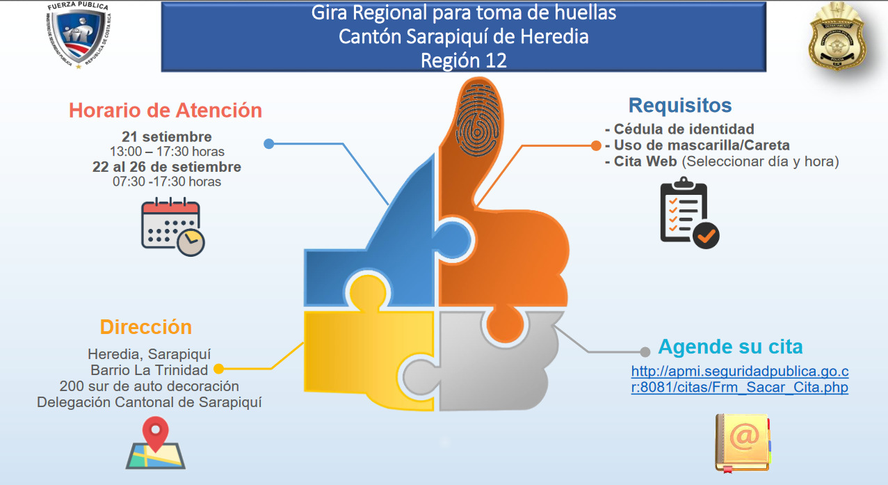 Con el afán de evitar la aglomeración de personas y agilizar los trámites de toma de huellas en San José, el Ministerio de Seguridad Pública anuncia que a partir del próximo 21 de setiembre llevará el servicio a varias provincias.