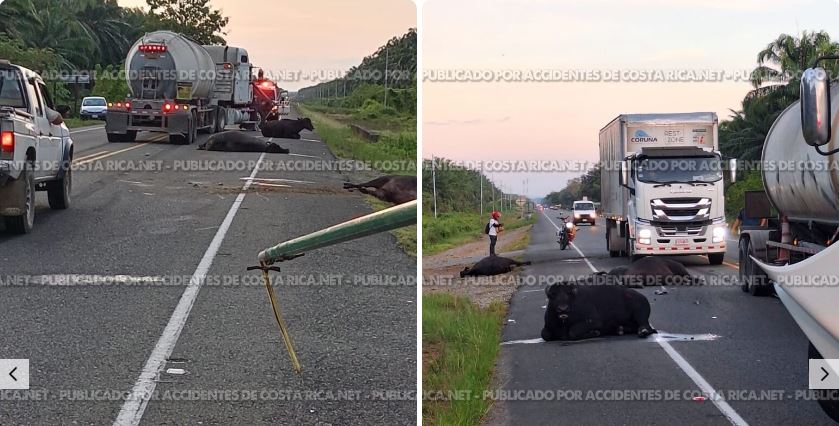 𝙋𝙤𝙧 𝘼𝙘𝙘𝙞𝙙𝙚𝙣𝙩𝙚𝙨𝙙𝙚𝙘𝙤𝙨𝙩𝙖𝙧𝙞𝙘𝙖.𝙣𝙚𝙩. En un lamentable suceso registrado esta mañana en la Ruta 34, en el tramo entre Quepos y Parrita, varios búfalos de agua se escaparon de sus corrales y provocaron una colisión con un vehículo pesado.