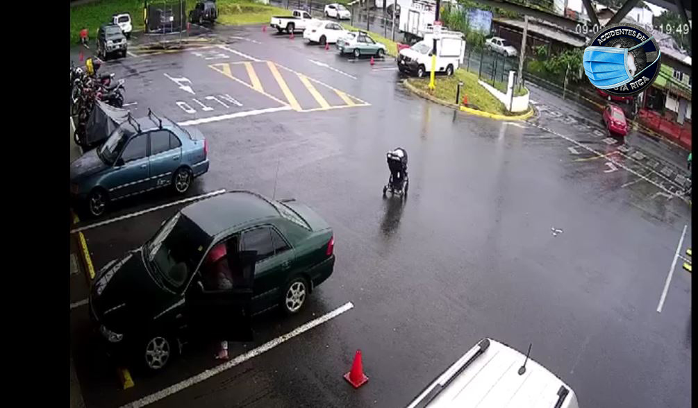 Un video que circula en redes sociales muestra el momento en que un cochecito con un bebe, empieza a rodar en un parqueo de vehiculos.