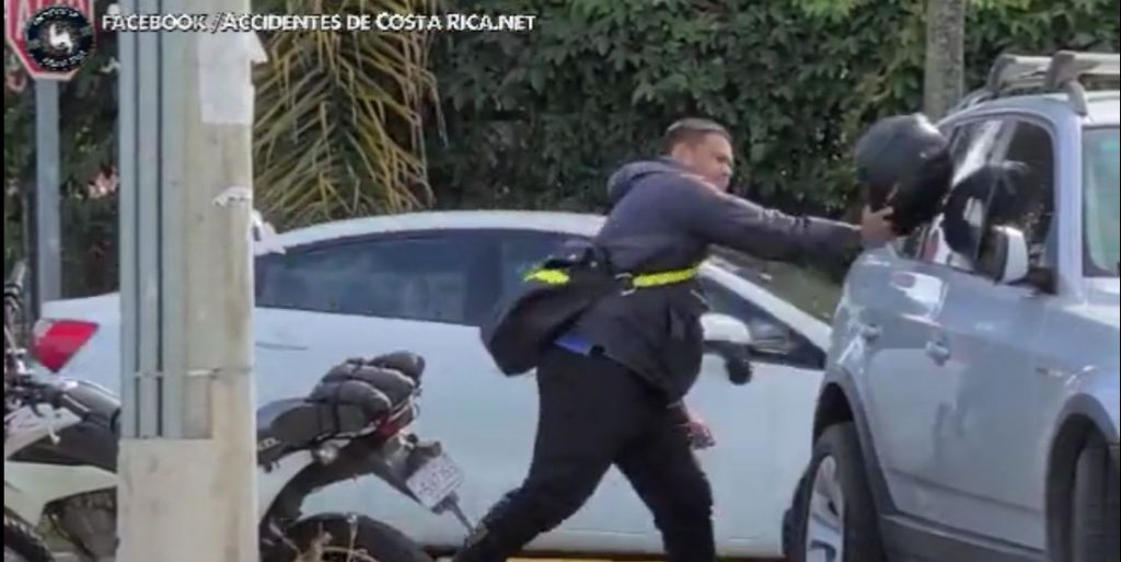 Al parecer por una situacion de conduccion que no tenemos muy clara, se inicio la discusion , en la cual el sujeto golpea el vehiculo con el casco, y termina rompiendo al menos un vidrio.