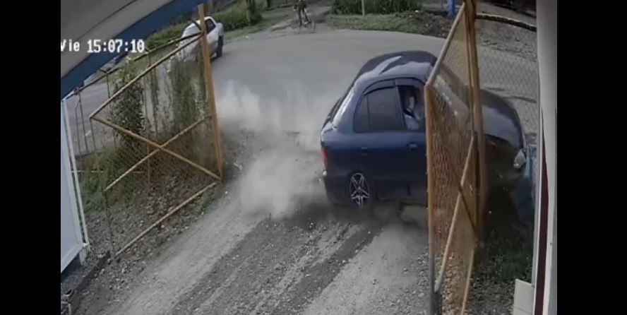 El conductor victima en este caso, trato de evitar la colision contra el otro vehiculo, pero perdio el control y termino chocando contra un porton, tal y como se aprecia en el siguiente video.