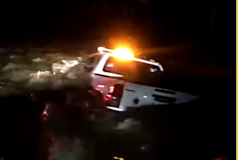 Segun nos informo el Ministerio de Seguridad Publica, el vehiculo policial, se cuneteo y fue arrastrada por el agua.
