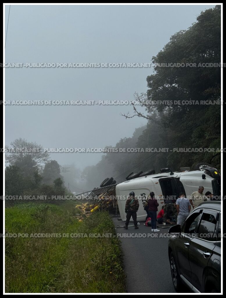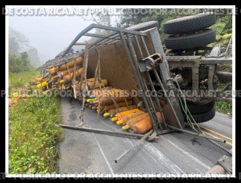 Una situación de alto riesgo se registra este domingo en El Guarco, Cartago, específicamente en San Isidro, 50 metros del restaurante La Chonta en dirección hacia Pérez Zeledón, tras el vuelco de un vehículo de carga pesada.